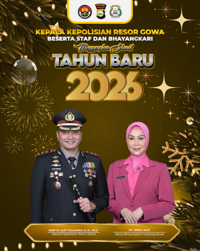 “Kami keluarga besar Polres Gowa mengucapkan Selamat Tahun Baru 2026. Semoga di tahun yang baru ini kita semua diberikan kesehatan, keselamatan, serta senantiasa dalam lindungan Tuhan Yang Maha Esa,” ujar AKBP Muhammad Aldy Sulaiman.