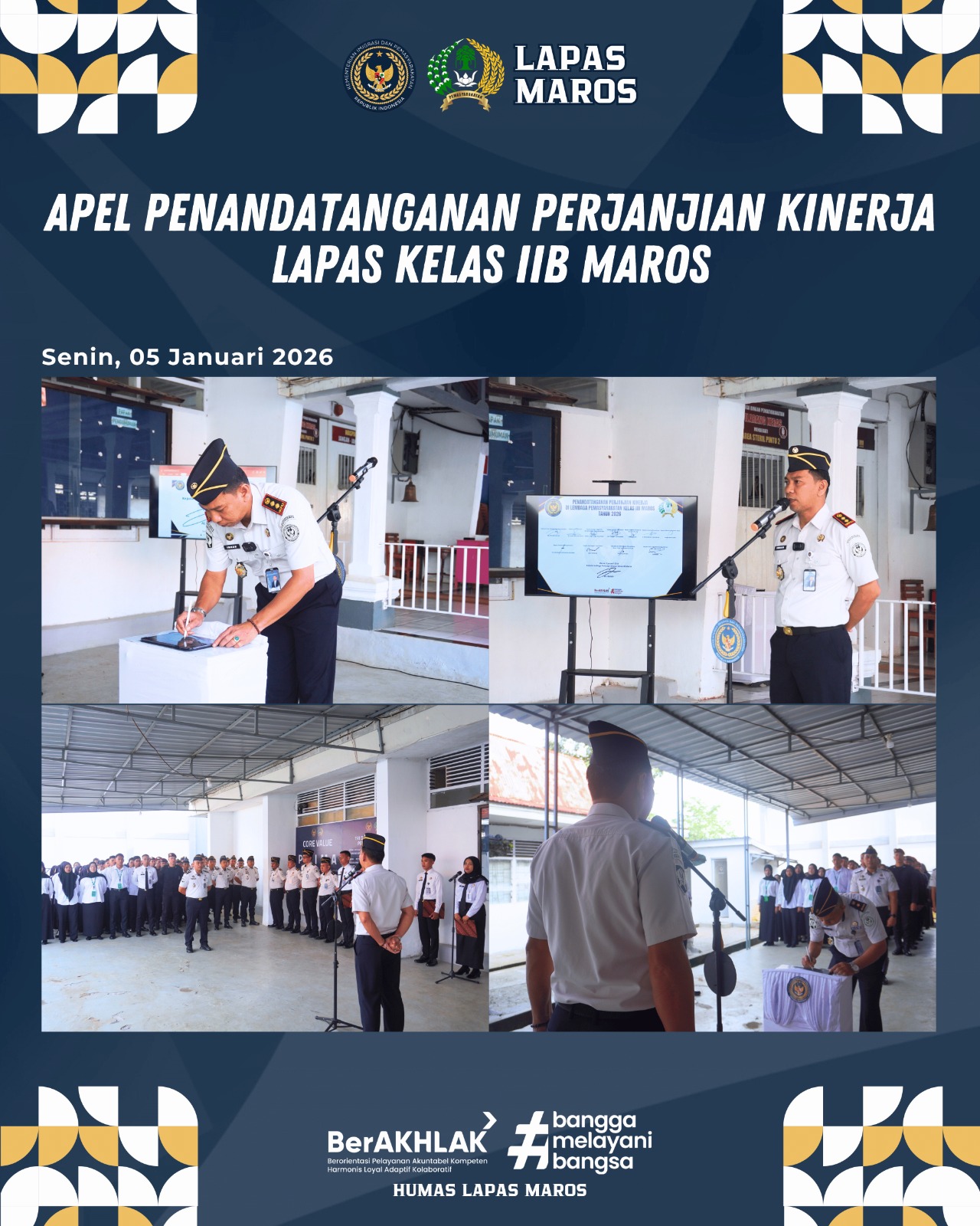 MAROS — Lembaga Pemasyarakatan (Lapas) Kelas IIB Maros melaksanakan penandatanganan Perjanjian Kinerja Tahun 2026 sebagai upaya memperkuat akuntabilitas kinerja serta mewujudkan tata kelola pemerintahan yang profesional dan berorientasi pada hasil, Senin (05/01). Kegiatan ini menjadi bagian dari mekanisme perencanaan dan pengendalian kinerja yang dilaksanakan secara berkelanjutan. Melalui kegiatan tersebut, Lapas Kelas IIB Maros menegaskan komitmen dalam mendukung pelaksanaan reformasi birokrasi di lingkungan pemasyarakatan.