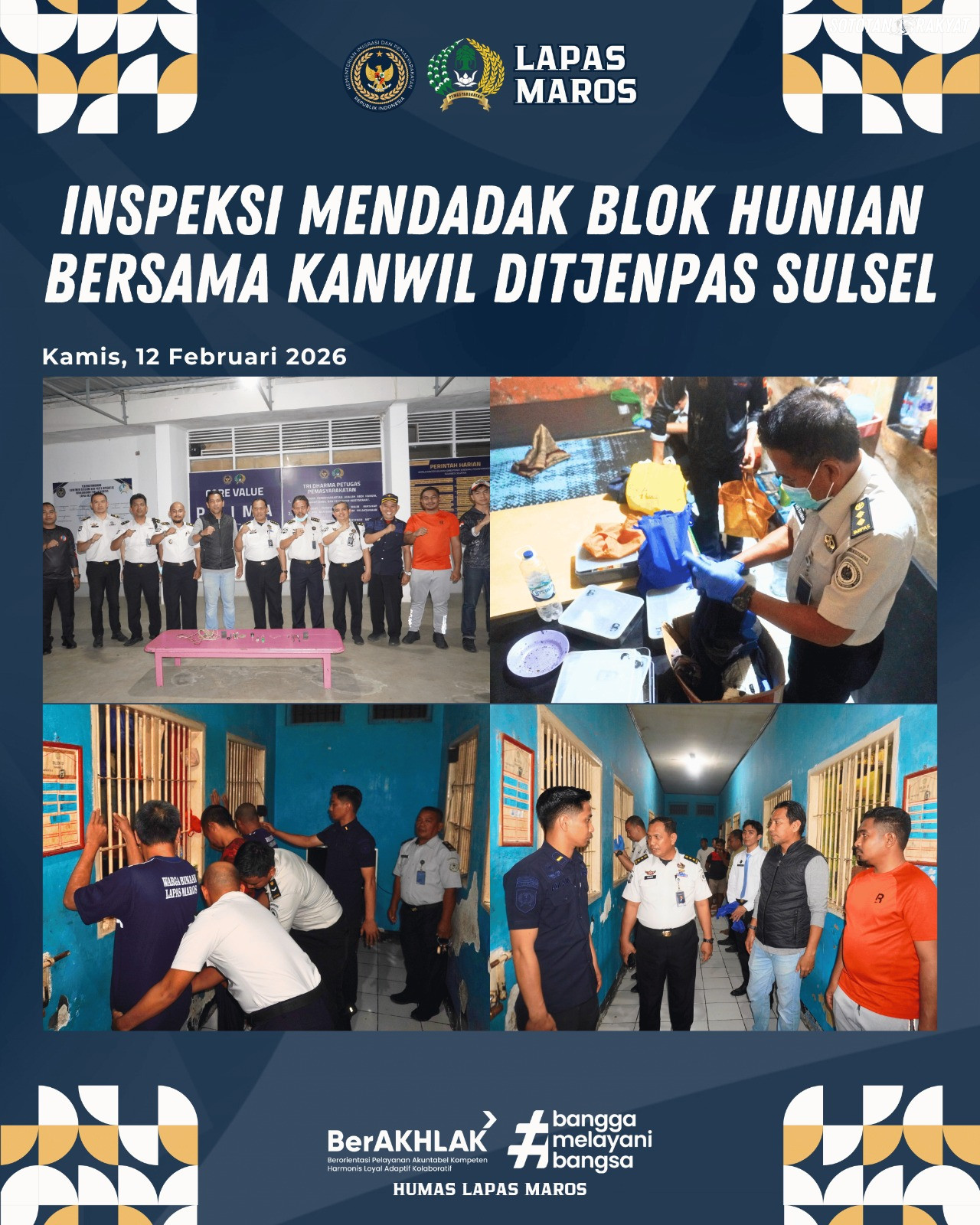 MAROS — Lembaga Pemasyarakatan (Lapas) Kelas IIB Maros bersama Kantor Wilayah Direktorat Jenderal Pemasyarakatan Sulawesi Selatan (Kanwil Ditjenpas Sulsel) menggelar inspeksi mendadak (sidak) gabungan, sebagai bagian dari upaya penguatan pengawasan dan deteksi dini gangguan keamanan dan ketertiban. Kegiatan tersebut dilaksanakan dengan menyasar sejumlah blok hunian warga binaan, Kamis (12/02).