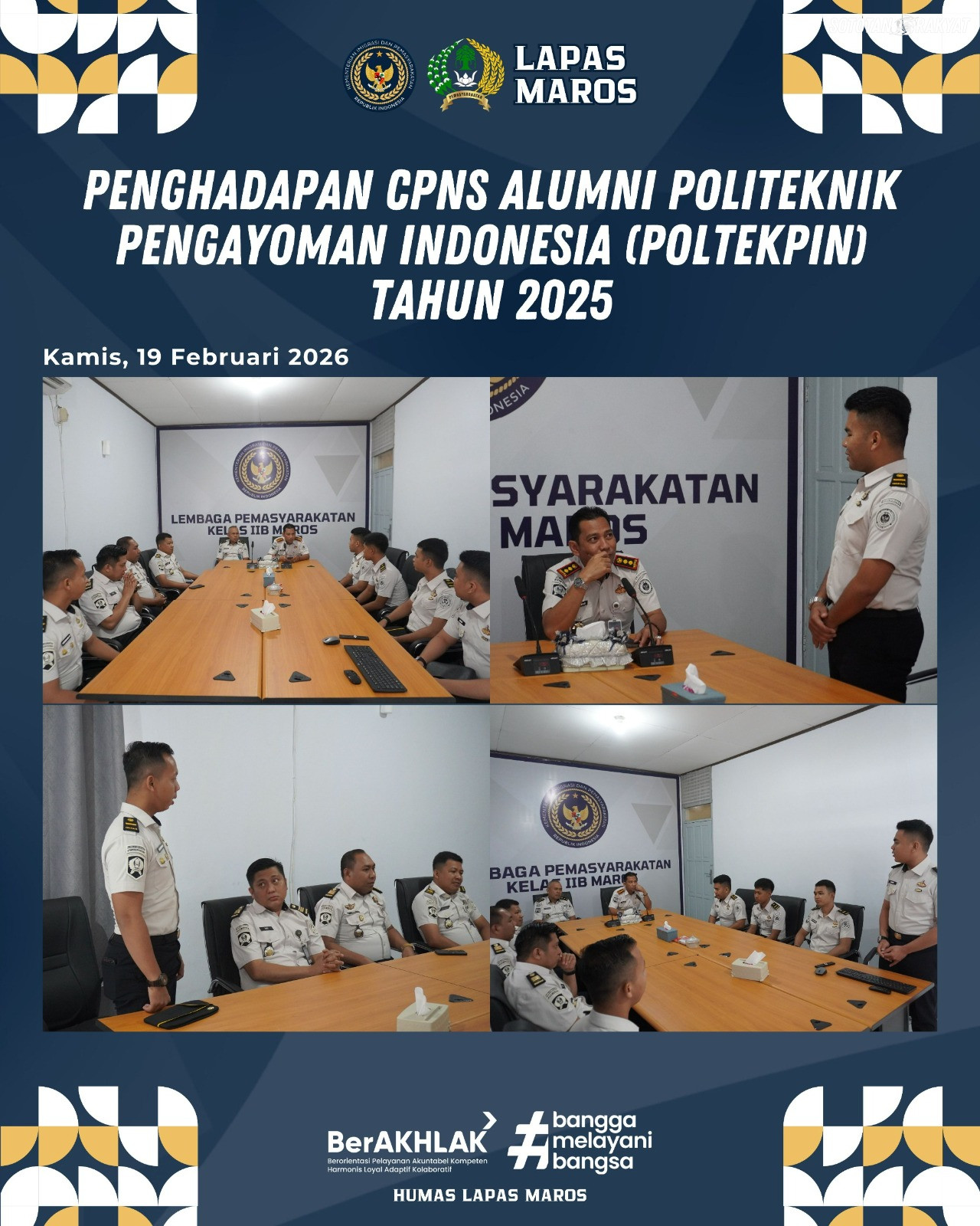 Maros — Lembaga Pemasyarakatan (Lapas) Kelas IIB Maros menerima lima Calon Pegawai Negeri Sipil (CPNS) lulusan Politeknik Pengayoman Indonesia (Poltekpin) untuk memperkuat pelaksanaan tugas dan fungsi pemasyarakatan. Penerimaan tersebut ditandai dengan kegiatan pengarahan dan pengenalan lingkungan kerja yang dilaksanakan di aula lapas, Kamis (19/02).