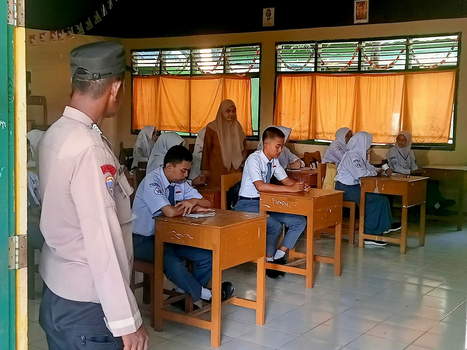 Sejak pukul 07.30 WITA, Bhabinkamtibmas Kelurahan Malewang, BRIPKA Basri, telah bersiaga di lokasi untuk mengawal jalannya ujian serta mengantisipasi potensi gangguan keamanan di lingkungan sekolah.