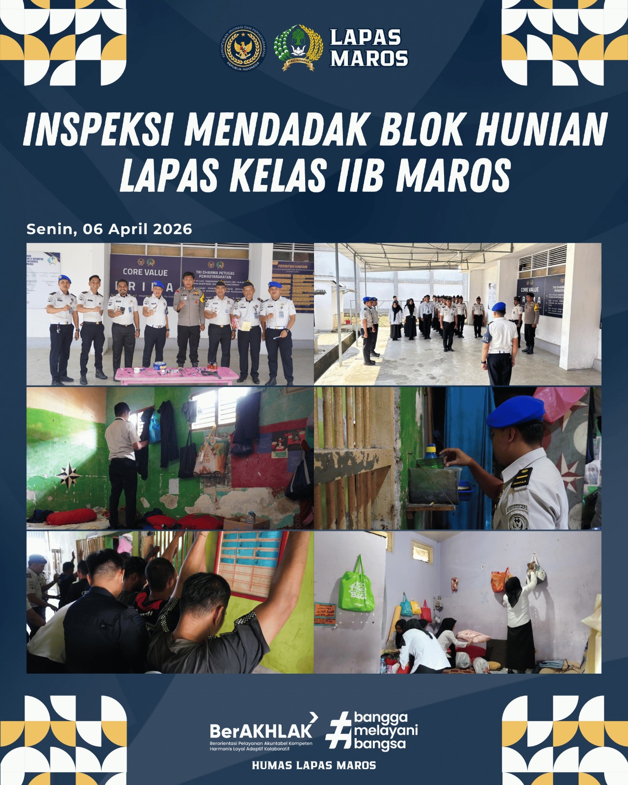 MAROS — Dalam rangka memperingati Hari Bakti Pemasyarakatan ke-62, Lembaga Pemasyarakatan (Lapas) Kelas IIB Maros melaksanakan inspeksi mendadak (sidak) gabungan bersama aparat penegak hukum (APH), sebagai upaya memperkuat keamanan dan ketertiban di lingkungan Lapas Maros, Senin (06/04).