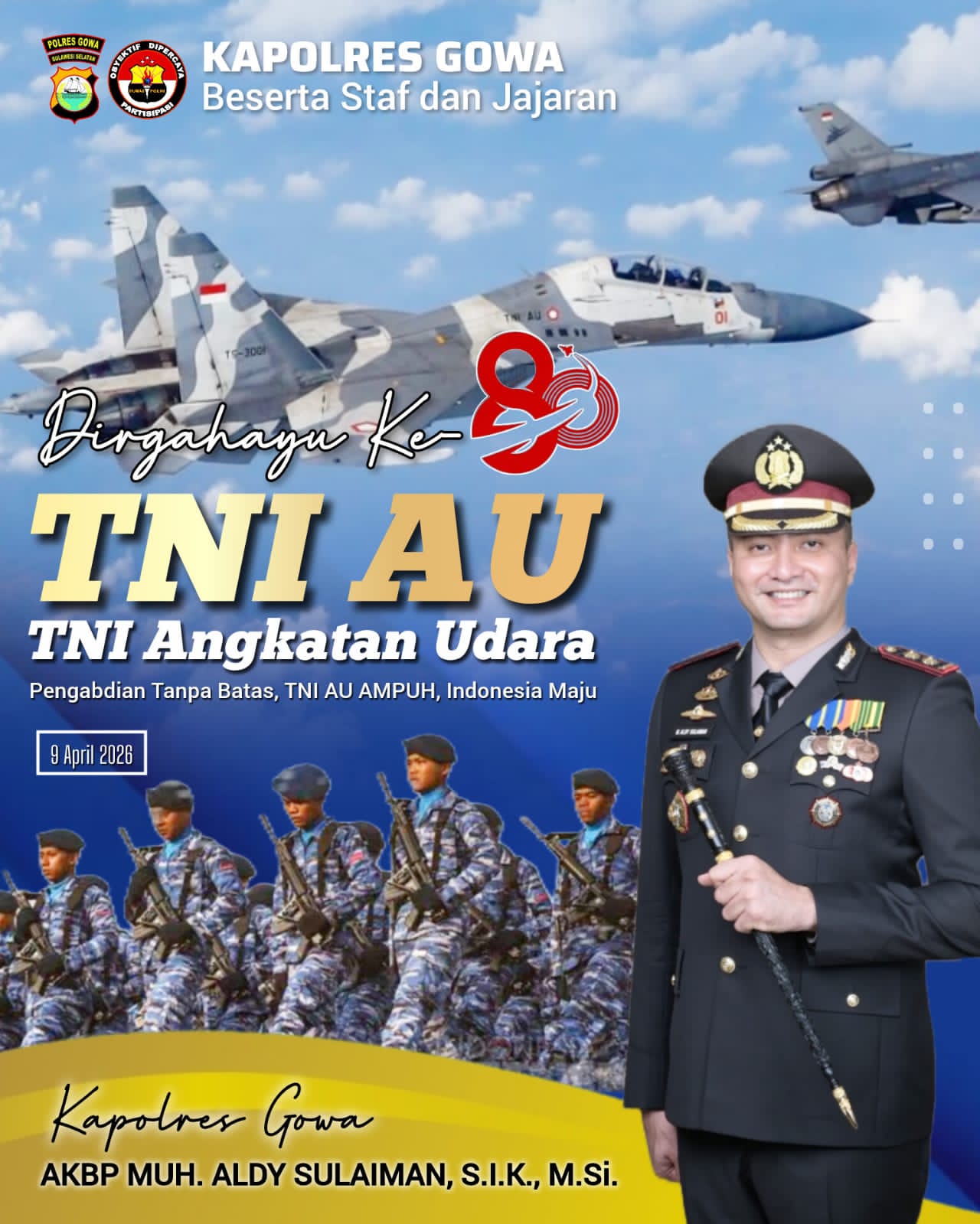 “Atas nama keluarga besar Polres Gowa, kami mengucapkan Selamat Dirgahayu ke-80 TNI Angkatan Udara. Semoga semakin profesional, modern, dan terus bersinergi bersama Polri dalam menjaga keutuhan NKRI serta mewujudkan Indonesia maju,” ungkapnya.