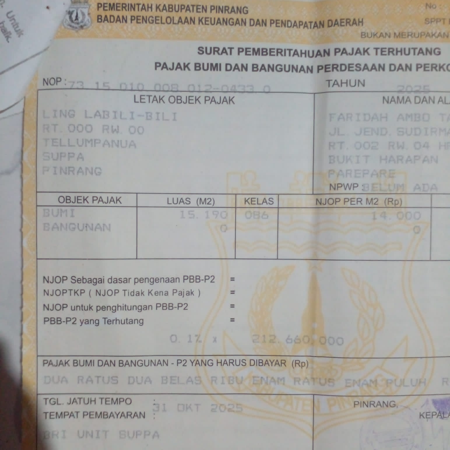 Berdasarkan dokumen SPPT PBB tahun 2025 yang diterbitkan oleh Pemerintah Kabupaten Pinrang, tercatat data sebagai berikut: