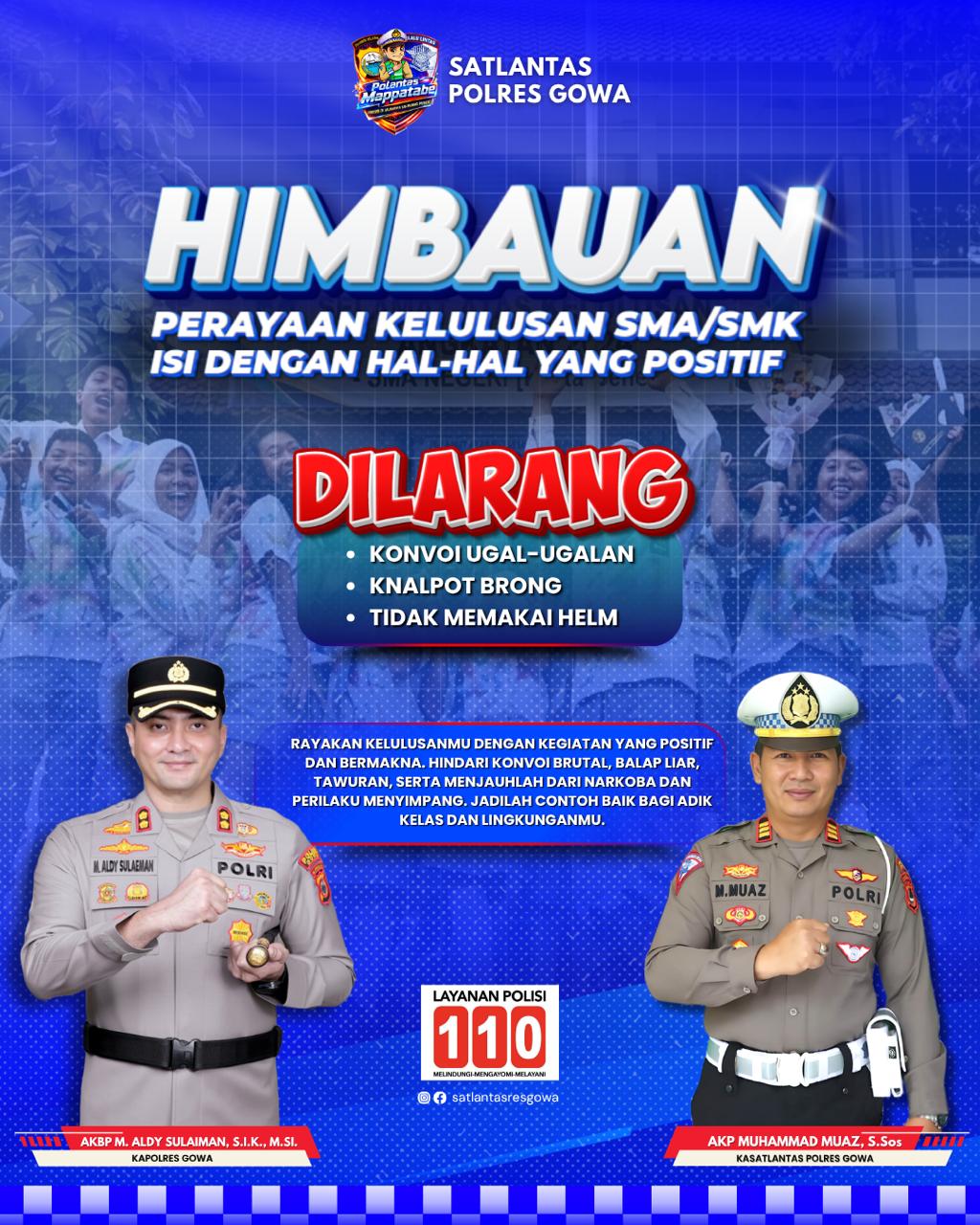 Dalam imbauan tersebut, Polres Gowa menegaskan bahwa kegiatan konvoi kendaraan di jalan raya dilarang karena berpotensi menimbulkan kemacetan, gangguan keamanan, hingga risiko terjadinya tawuran antar pelajar.
