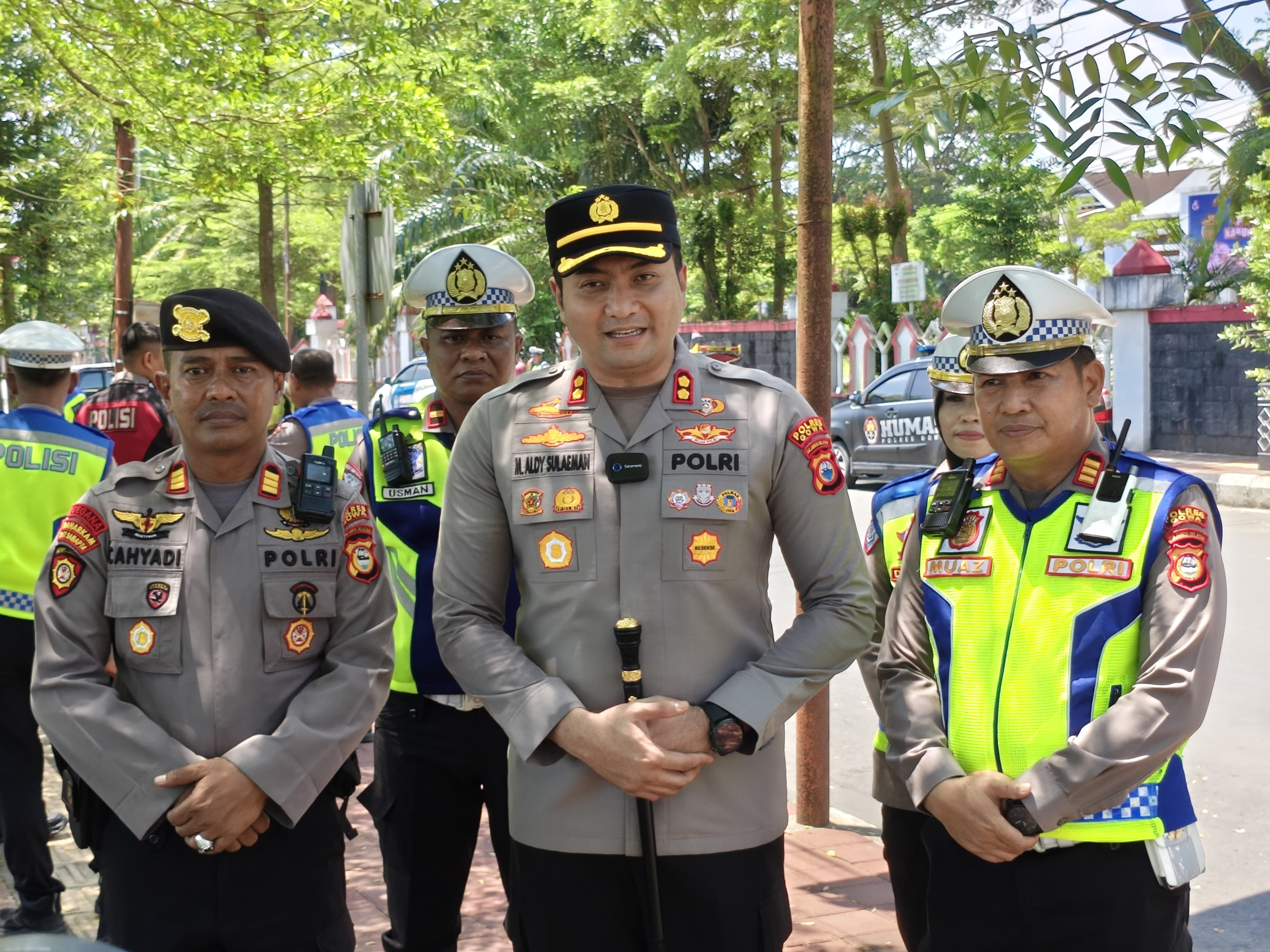 Kapolres Gowa AKBP Muhammad Aldy Sulaiman, S.I.K, M.Si kembali turun langsung ke jalan bersama Kasat Lantas Muhammad Muaz, S,Sos dan personel Satlantas dan Satsamapta Polres Gowa untuk membagikan helm gratis kepada pengendara sepeda motor yang tidak menggunakan helm, baik pengendara maupun penumpangnya.